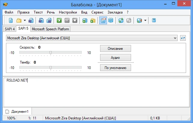 The application offers a simple interface. After launch, you’ll need to choose between SAPI4 and SAPI5. The article covers both engines. Alena works with both 4 and 5, so you can see for yourself. Balabolka can read aloud books, PDFs, DOCs, HTML, and other documents. The screenshot demonstrates how precise the pronunciation settings, reading speed, and other characteristics can be, which is definitely a positive.