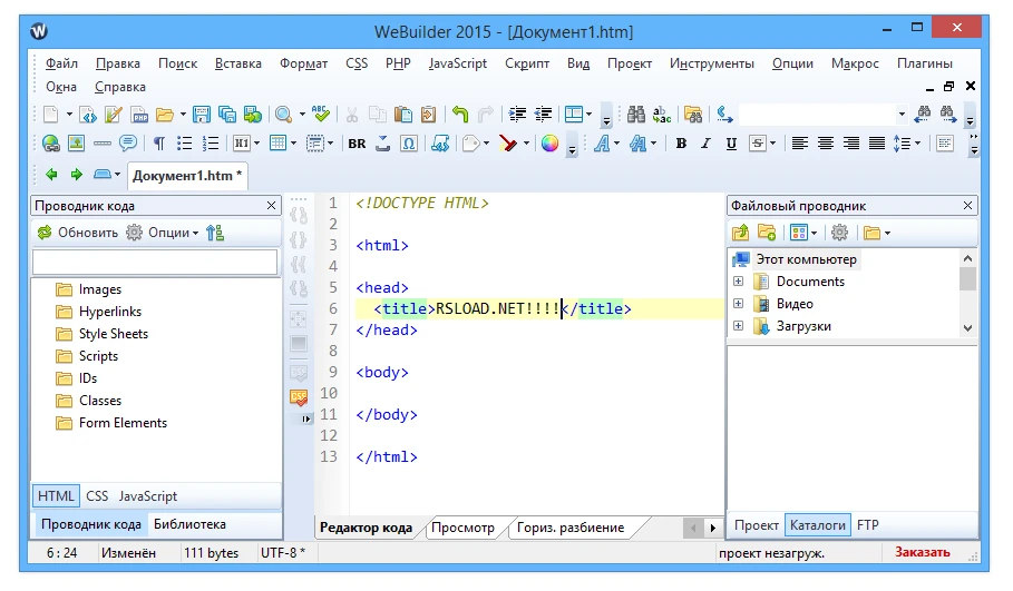 The WeBuilder editor offers many customization options. To make work easier, you can add hotkeys, create toolbars with the necessary options, and add your own menu codes. The generated code can be stored for later use or rapidly copied and pasted wherever needed. Naturally, WeBuilder has its own FTP server manager, so once a page, website, or other project is finished, you can upload it to the server right away.