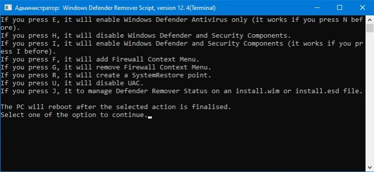 - The interface is console-based; choose the desired item by letter, and the application will reboot your machine and apply the modifications.