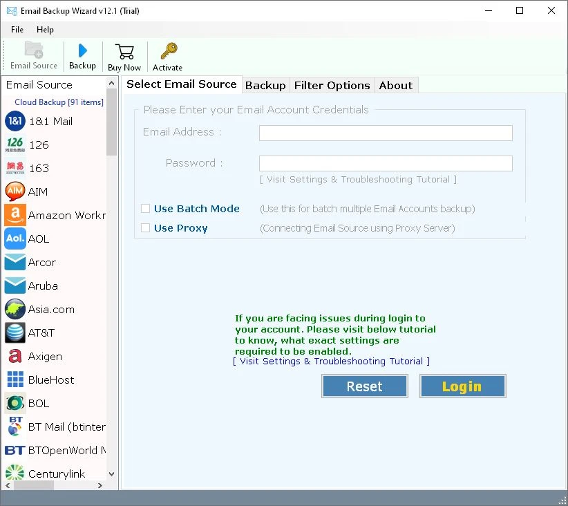 To begin, select the email provider you want to use (listed on the left). Next, enter your username and password. If you are concerned about the security of your data, I strongly advise against doing this. Once your account is connected, proceed to the next tab to select the output format. If necessary, a few clicks will export all emails simultaneously; PST, MBOX, PDF, and other formats are supported. There are also built-in filters that let you select which emails, subjects, attachments, and other items are required.