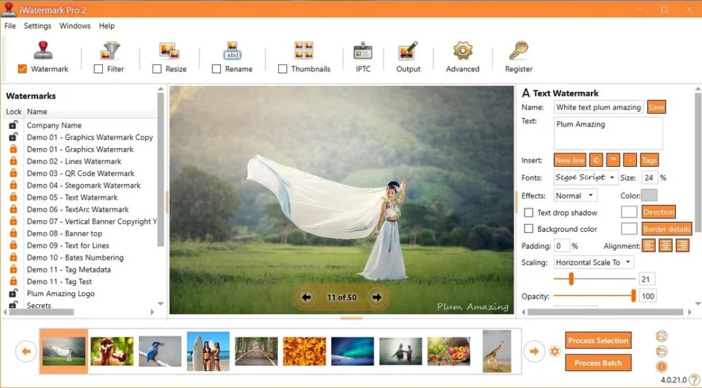 - All forms of watermarks are configurable. Position, scale, rotation angle, transparency level, shadow, and effects can all be customized.