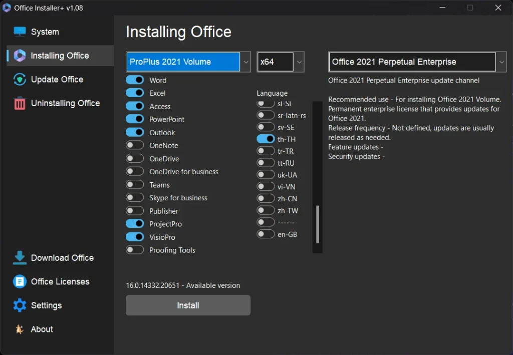 - Go to the tab “Installing Office”, tick Select the Office model, x86 x64 system and desired language