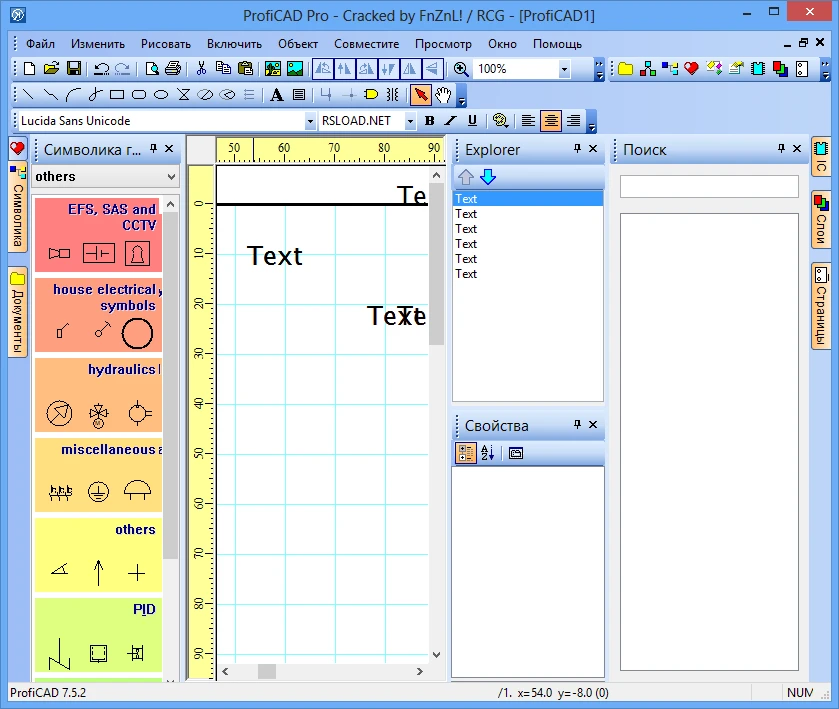 Overall, it is a straightforward tool for making diagrams that does not necessitate extensive CAD experience, which is a significant advantage. The interface is straightforward, the most recent versions support Russian (at the time of writing), and Unicode support is well-implemented. The built-in database contains over 700 ready-made symbols; select the required element and add it to the diagram.