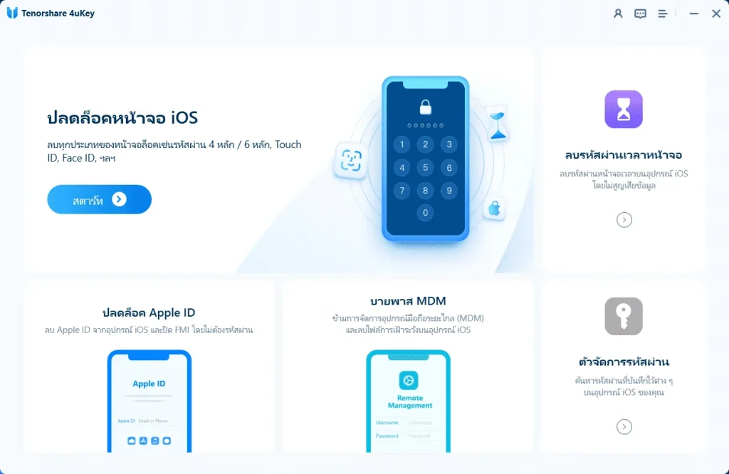 The UI is visually appealing, with a clean white, blue, and light blue design, with simple options like unlocking Apple ID, deleting screen time passwords, and bypassing MDM. Tenorshare 4uKey provides an easy way to unlock and manage Apple devices.