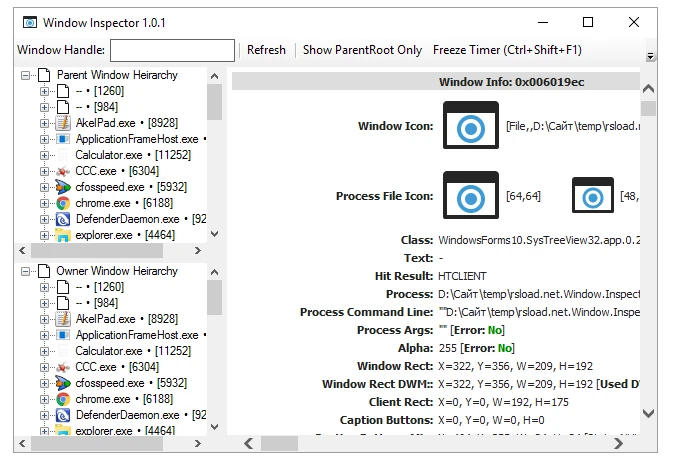 The interface is logically split and straightforward: on the left is the process tree, which displays all connected windows; on the right is comprehensive information. Double-click any item to explore its properties, icons, and hidden qualities.