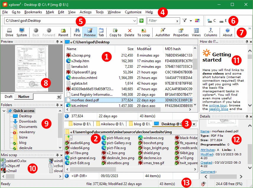 Favorites, clickable paths (breadcrumbs), simple access to root directories, a tree, and a bookmark pane (drop box) all let you swiftly navigate your shell namespace. You may even save and restore folder groups as your workflow requires. xplorer2’s browsing concept works well with big directories containing thousands of files. It reads quickly, including visual filters, and a number of selecting techniques to help you manage your files successfully.